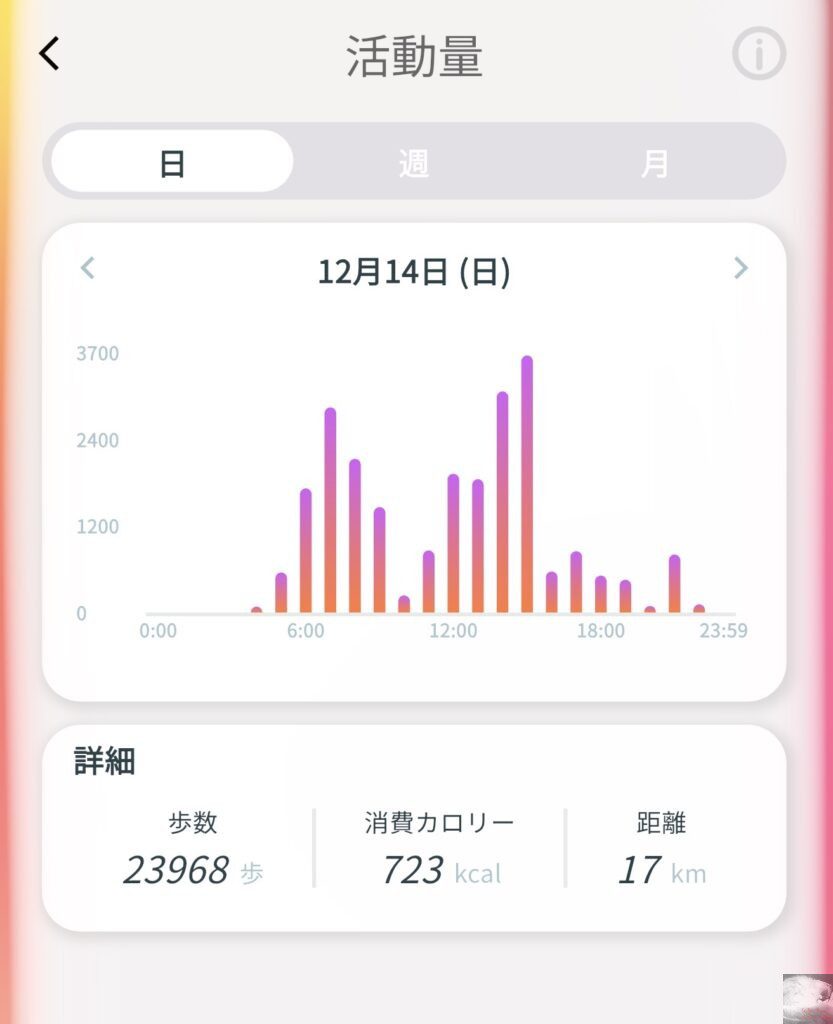 12月14日は夜行フェリーを利用して下関を観光してきた日だったのでHUAWEI WATCHやiPhone、スマートリングは風呂の時間以外は常に持ち歩いていた点で条件が全く同じであるにも関わらず歩数のバラツキが凄まじい結果でした。