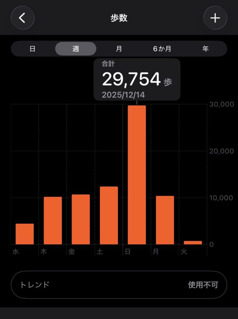 今までの経験ではiPhoneの約3万歩ぐらいの行程・疲労感だったので歩数計として利用したい人は注意が必要かもしれません。