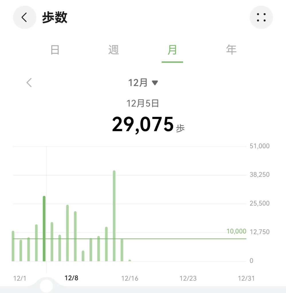 12月5日はスーパーに買い物に出掛けて夜飲みに出掛けただけなので約3万歩にはどう考えてもならないんですよね・・・。