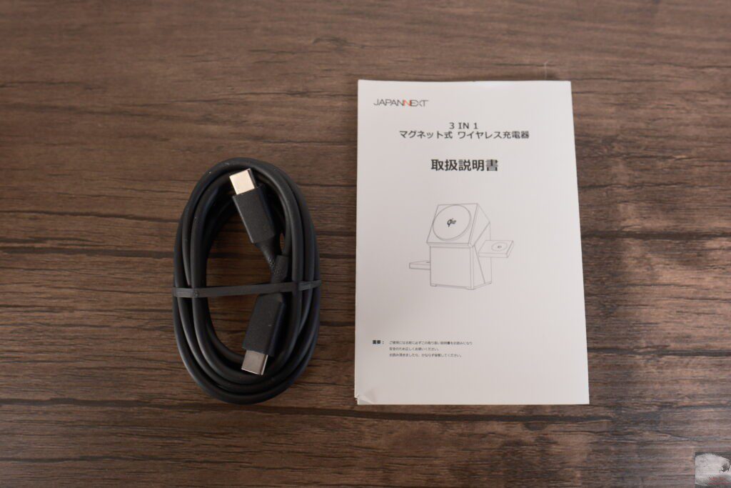 JAPANNEXTの3 in 1ワイヤレス充電スタンドの外観と付属品はこちらの通りです。