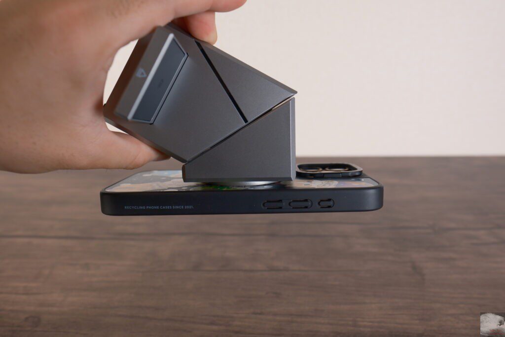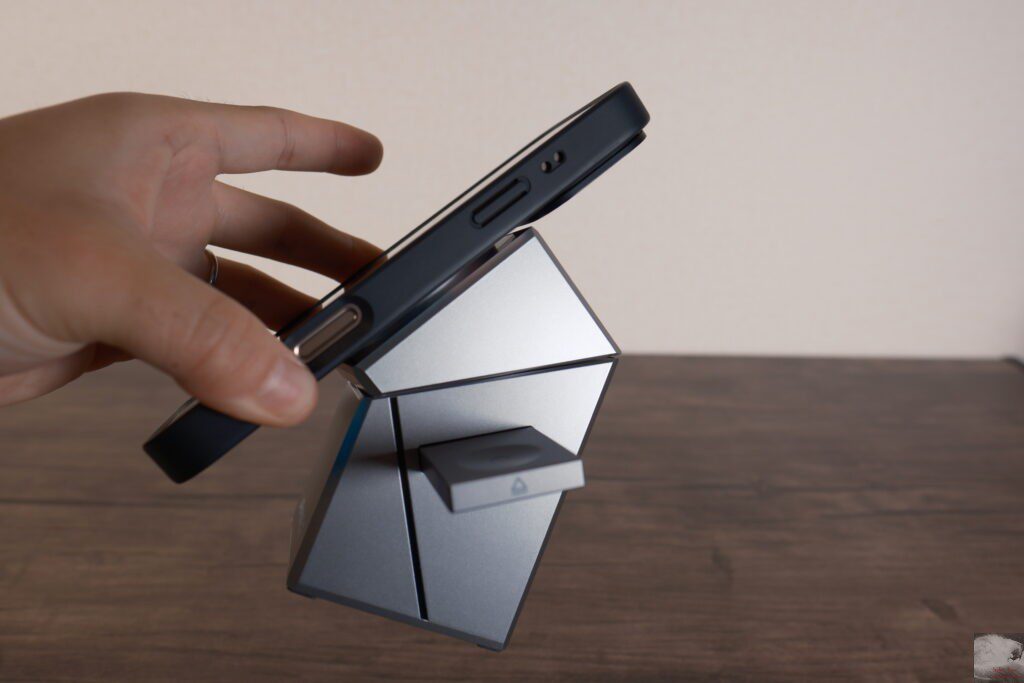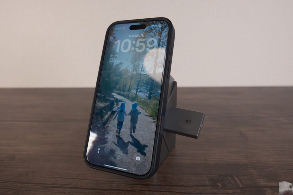 iPhone 16 Pro Maxに重めのケースをつけた状態で充電中に操作してもスタンドから外れたり落下することがないので卓上スタンドとしても活躍してくれています。