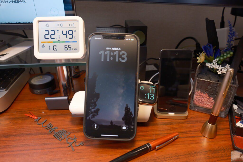 省スペースでありながらスマホとApple Watchとワイヤレスイヤホンの充電ができる優れモノです。