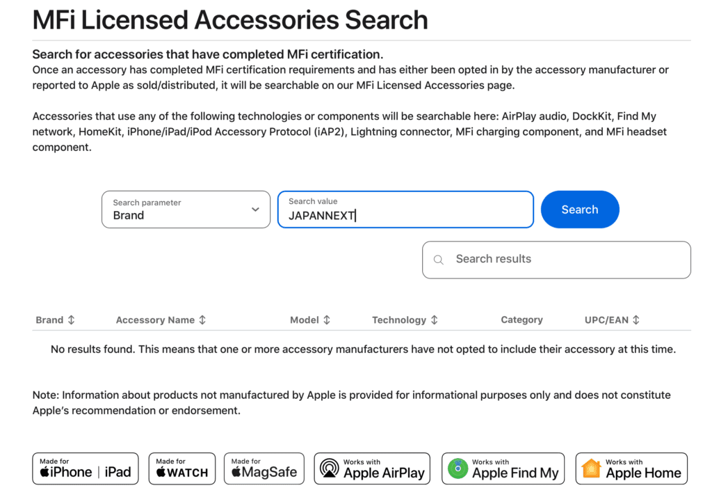 ホームページの記載漏れの可能性も考えられたので、MFi認定アクセサリの検索ページで検索してもヒットしなかったことから認定を取得していない点はまちがいなさそうです。