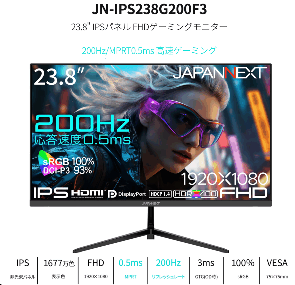 『JN-IPS238G200F3』は2万円で購入できるゲーミングモニターです。