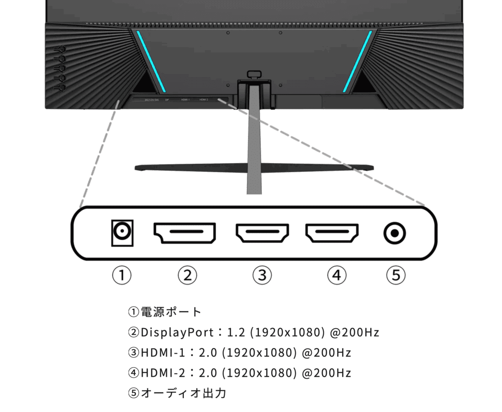 搭載されているポートはHDMポートが2つとDPポートが一つで全て200Hzに対応しています。