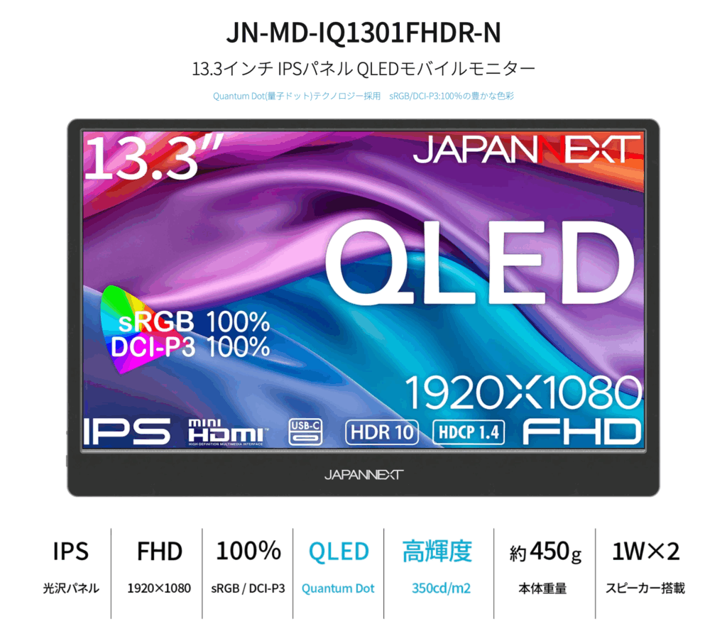 『JN-MD-IQ1301FHDR-N』は最近ちらほらと見かけるようになったQLED採用のモバイルディスプレイです。