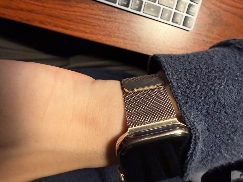 人によっては就寝時は別のバンドに付け替える人もいるようですが、私は気にせずミラネーゼループを両腕に着けて寝ています。