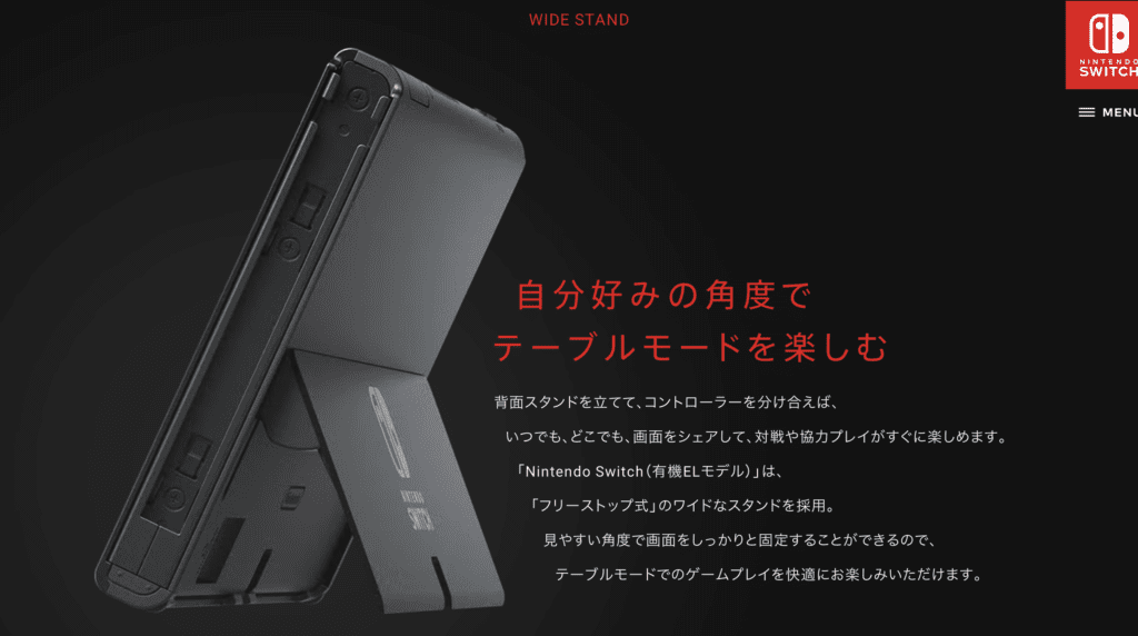 というのも、Switchをテーブルに置いて遊ぶ際に初代Switchでは角度調整ができないので画面が見えにくく使い勝手が悪いと感じたからです。