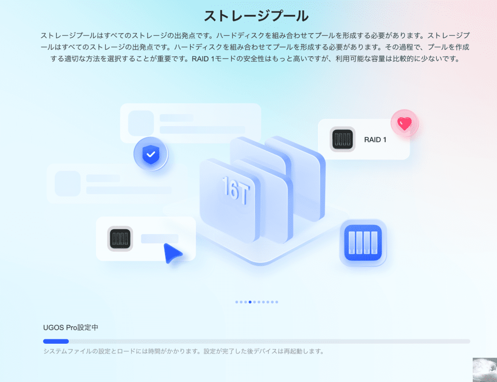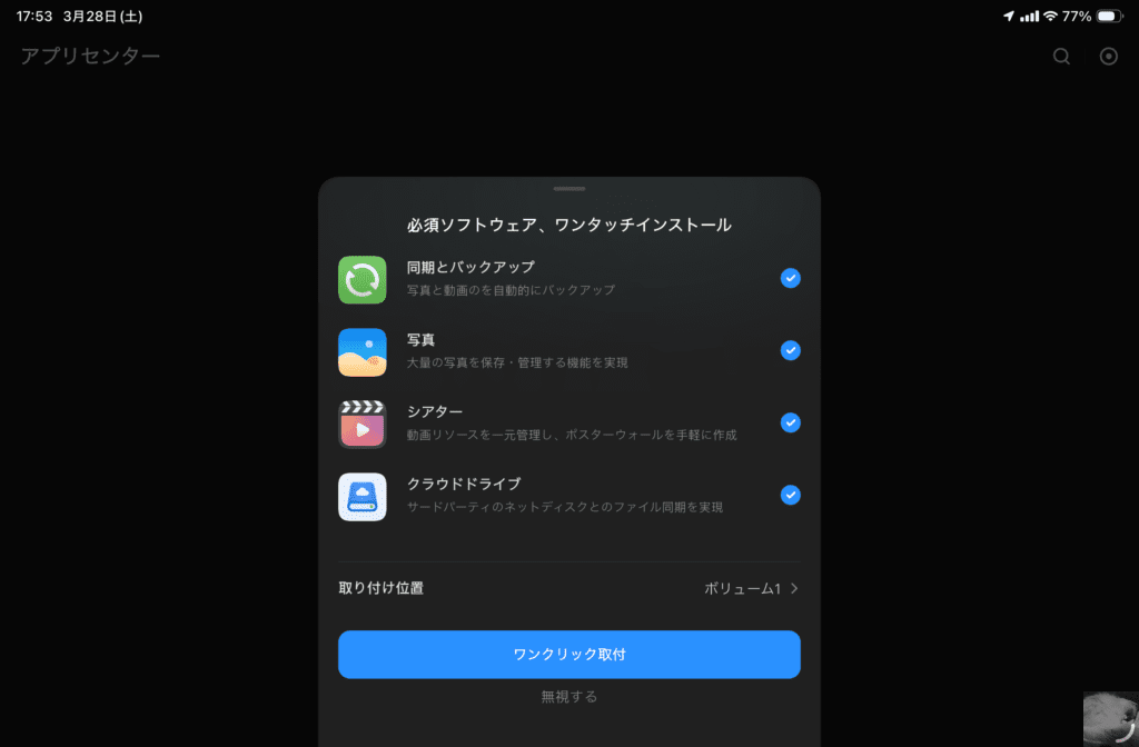 NAS初心者にとって一番の鬼門とも言えるセットアップはナビゲーションに従うだけのシンプルな操作だったので助かりました。