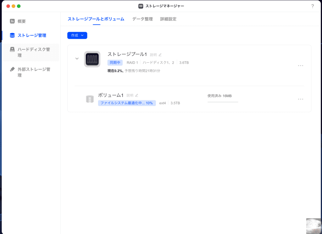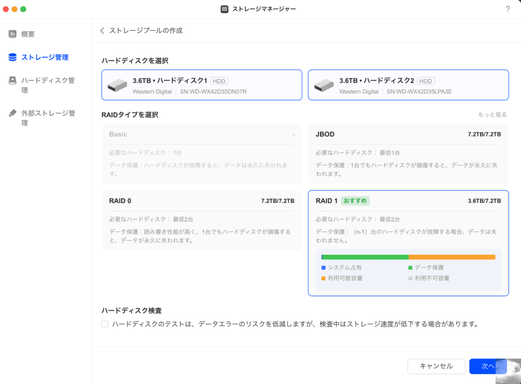 今回はデータを失いにくいRAID 1でNASを設定しました。