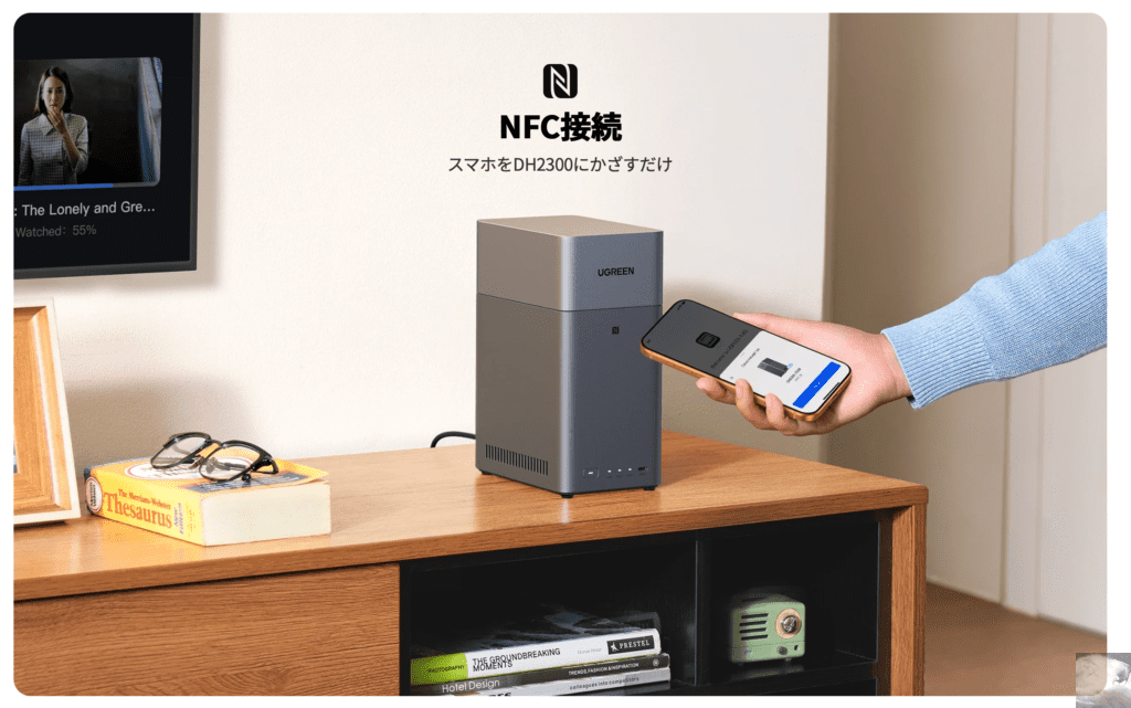 スマホをかざすだけでNFC接続ができたり、UGREEN NASync DH2300とテレビをHDMI接続するとバックアップした写真や動画をテレビで鑑賞することもできます。